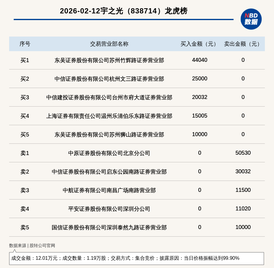 每经讯,2026年2月12日,新三板创新层公司宇之光(838714,收盘价:10元)登上龙虎榜,交易方式是集合竞价,披露原因是当日价格振幅达到99.90%,成交数量1.19万股,成交金额12.01万元。买一席位为东吴证券股份有限公司苏州竹辉路证券营业部,买入4.4万元;卖一席位为中原证券股份有限公司北京分公司,卖出5.05万元。