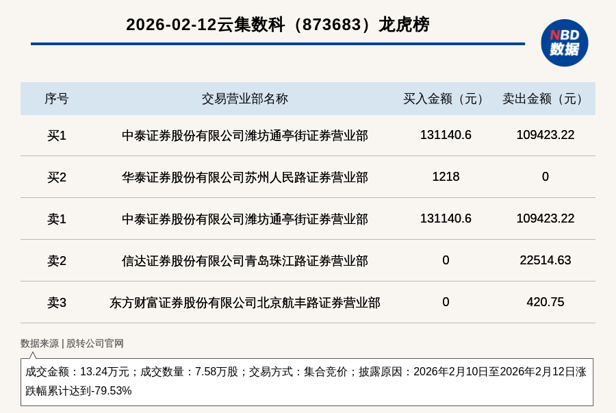 每经讯,2026年2月12日,新三板基础层公司云集数科(873683,收盘价:1.74元)登上龙虎榜,交易方式是集合竞价,披露原因是2026年2月10日至2026年2月12日涨跌幅累计达到-79.53%,成交数量7.58万股,成交金额13.24万元。买一席位为中泰证券股份有限公司潍坊通亭街证券营业部,买入13.11万元;卖一席位为中泰证券股份有限公司潍坊通亭街证券营业部,卖出10.94万元。