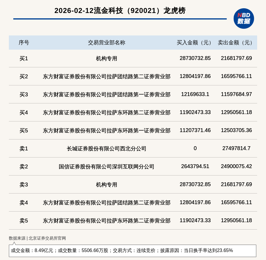 每经讯,2026年2月12日,北交所上市公司流金科技(920021,收盘价:15.24元)登上龙虎榜,交易方式是连续竞价,披露原因是当日换手率达到23.65%,成交数量5506.66万股,成交金额8.49亿元。买一席位为机构专用,买入2873.07万元;卖一席位为长城证券股份有限公司西北分公司,卖出2749.78万元。