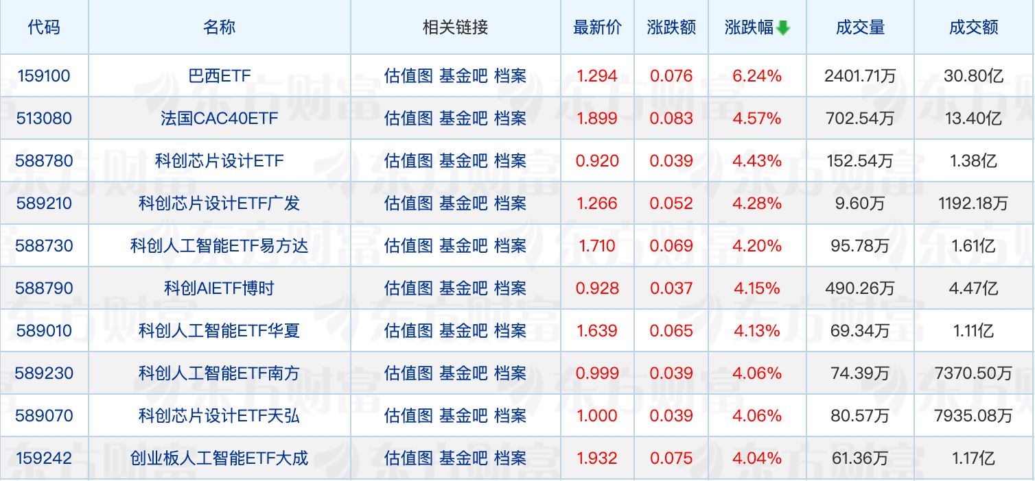 ETF涨跌幅方面,巴西ETF涨超6%,法国、科创芯片设计相关ETF涨超4%。