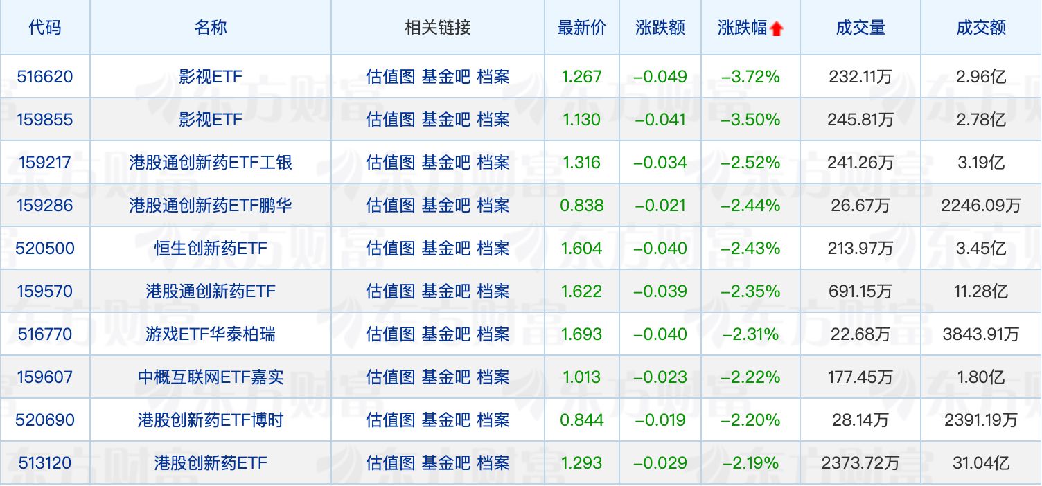 下跌方面,影视ETF跌超3%。