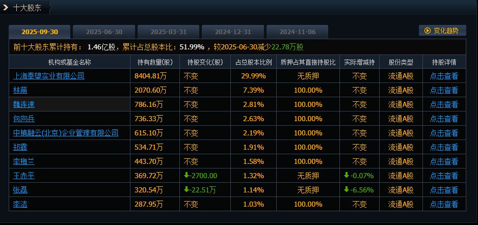 据以上数据计算,出席*ST宇顺现场会议的股东及股东授权委托代表中,反对股份占公司有表决权股份总数的比例约为4.53%。同花顺显示,截至2025年9月30日,*ST宇顺前十大股东合计持股比例占公司总股本的51.99%。其中,有八位股东的持股比例不足3%,还有七位股东所持股份处于100%质押状态。
