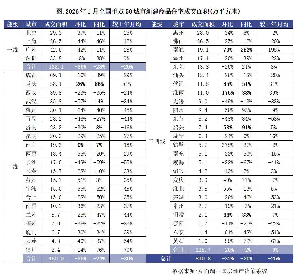 另据克而瑞监测,1月全国重点50城新房成交面积环比下降32%、同比减少20%,其中一线城市环比、同比分别下降36%和28%,降幅高于50城整体。