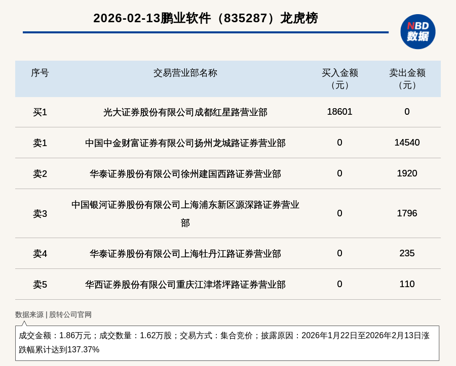 每经讯,2026年2月13日,新三板创新层公司鹏业软件(835287,收盘价:2.35元)登上龙虎榜,交易方式是集合竞价,披露原因是2026年1月22日至2026年2月13日涨跌幅累计达到137.37%,成交数量1.62万股,成交金额1.86万元。买一席位为光大证券股份有限公司成都红星路营业部,买入1.86万元;卖一席位为中国中金财富证券有限公司扬州龙城路证券营业部,卖出1.45万元。