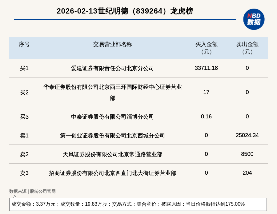 每经讯,2026年2月13日,新三板基础层公司世纪明德(839264,收盘价:0.44元)登上龙虎榜,交易方式是集合竞价,披露原因是当日价格振幅达到175.00%,成交数量19.83万股,成交金额3.37万元。买一席位为爱建证券有限责任公司北京分公司,买入3.37万元;卖一席位为第一创业证券股份有限公司北京西城分公司,卖出2.5万元。