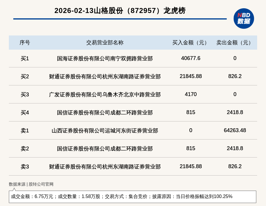 每经讯,2026年2月13日,新三板创新层公司山格股份(872957,收盘价:4.33元)登上龙虎榜,交易方式是集合竞价,披露原因是当日价格振幅达到100.25%,成交数量1.58万股,成交金额6.75万元。买一席位为国海证券股份有限公司南宁双拥路营业部,买入4.07万元;卖一席位为山西证券股份有限公司运城河东街证券营业部,卖出6.43万元。