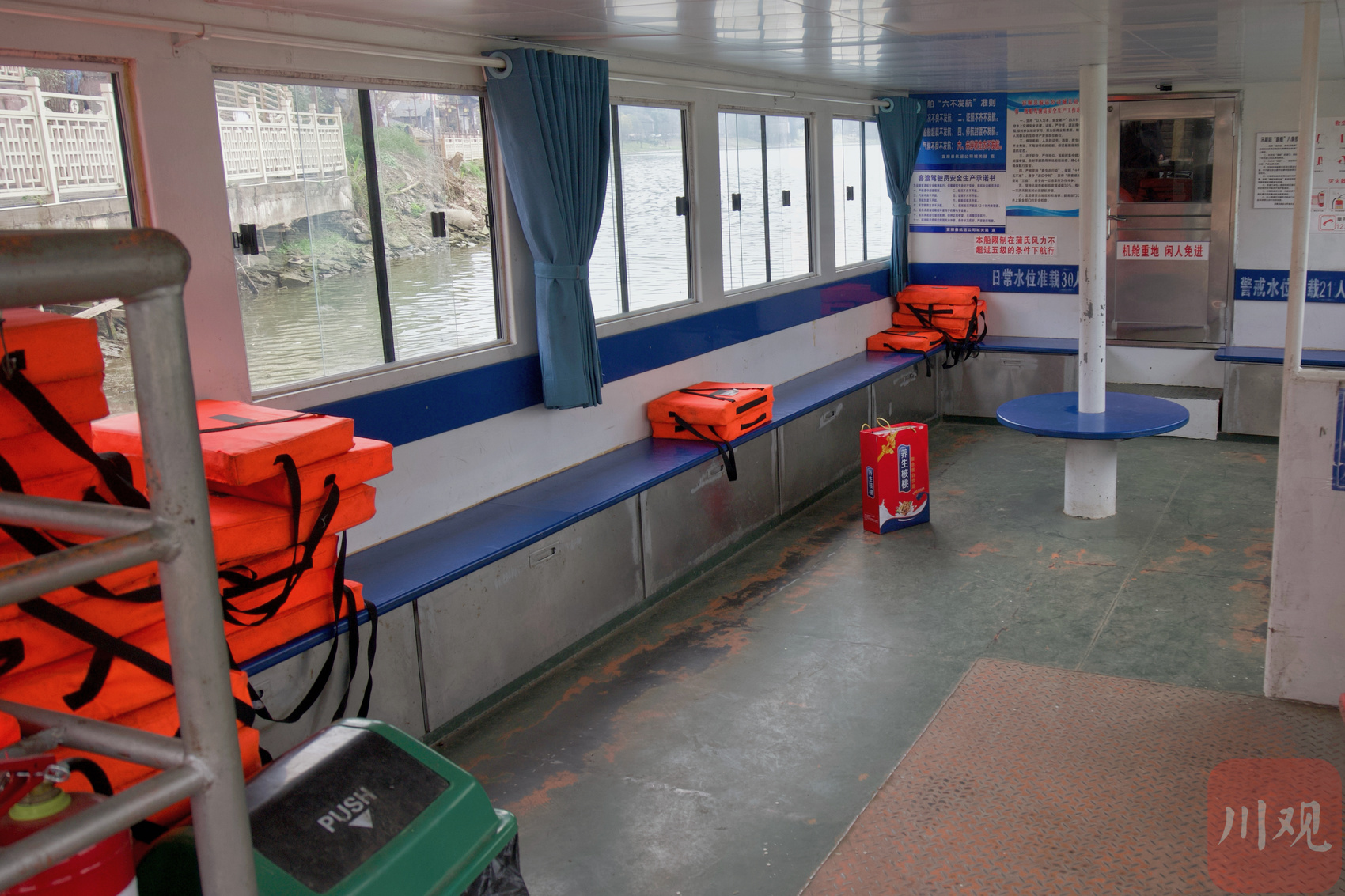 张同伙驾驶的四川“平安渡运”标准客渡船内部。