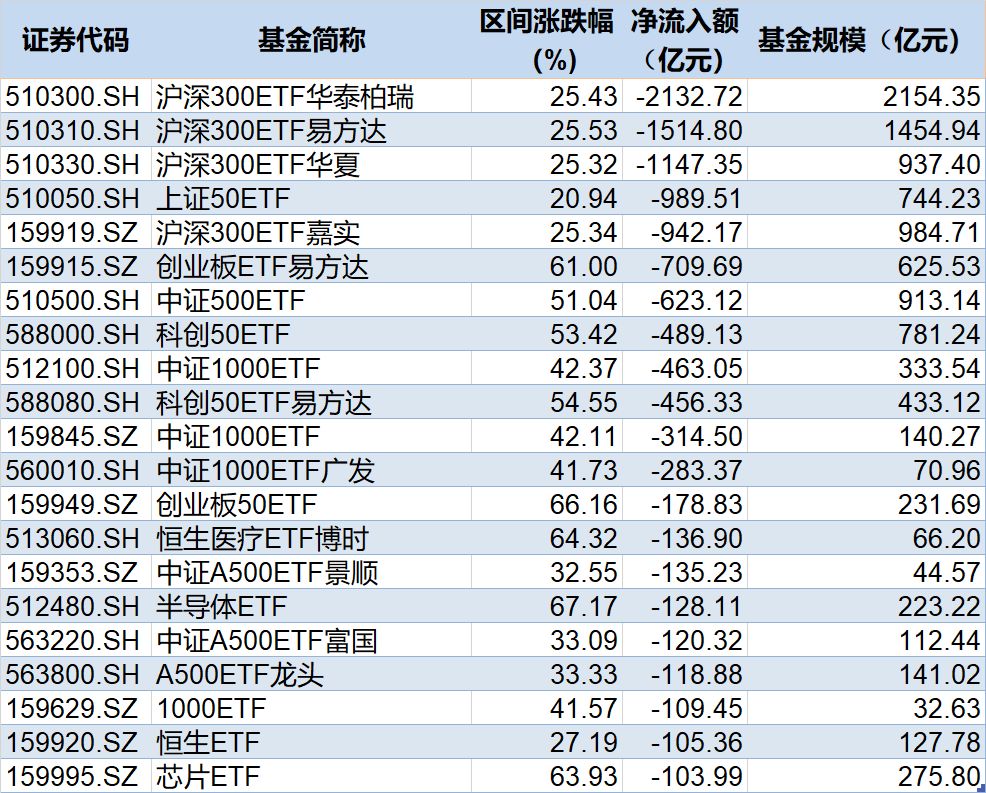 在资金流出方面,蛇年有21只ETF净流出逾100亿元,其中沪深300ETF华泰柏瑞、沪深300ETF易方达、沪深300ETF华夏分别净流出资金2132.72亿元、1514.8亿元和1147.35亿元。