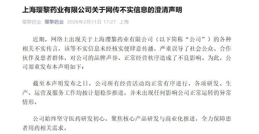 针对上述传闻,2月11日,璎黎药业发布声明称,公司所有经营活动均正常有序进行,各项研发、生产、运营及服务工作均按计划稳步推进,并未出现任何影响公司正常运转的异常情形。