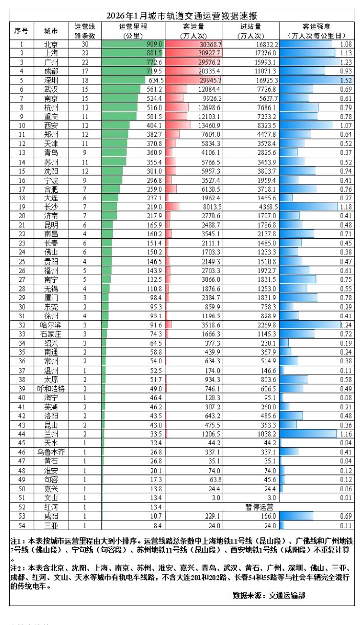 “交通运输部”微信号发布2026年1月城市轨道交通运营数据速报。2026年1月,31个省(自治区、直辖市)和新疆生产建设兵团共有54个城市开通运营城市轨道交通线路345条,运营里程11767.3公里,实际开行列车380万列次,完成客运量28.9亿人次,进站量17.2亿人次。