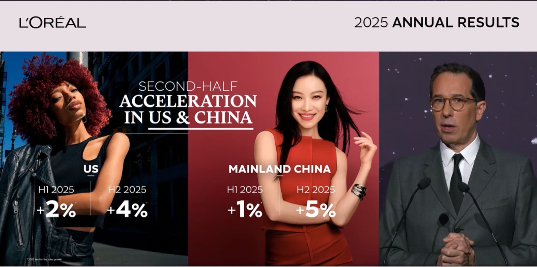 欧莱雅首席财务官Christophe Babule在业绩会上透露,欧莱雅2025年在中国市场的销售额从上半年的增长1%,提升到下半年的增长5%。“中国是我们在北亚区的最大单一市场。中国市场的增长得益于市场的复苏,尤其是在高档化妆品部门。”