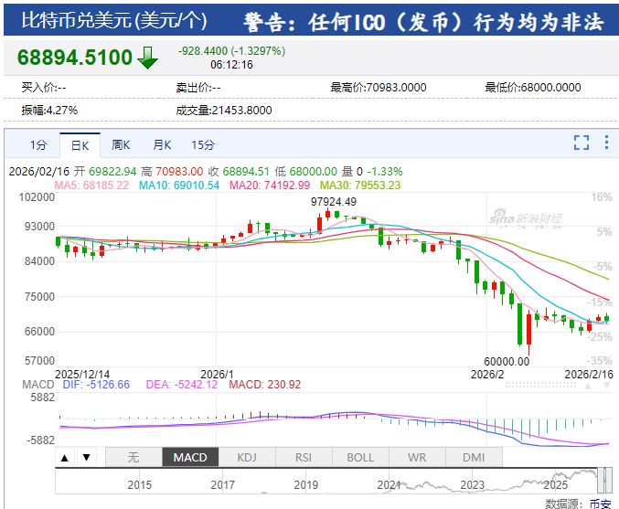 截至2月16日发稿,比特币报68894.51美元,跌幅1.32%。
