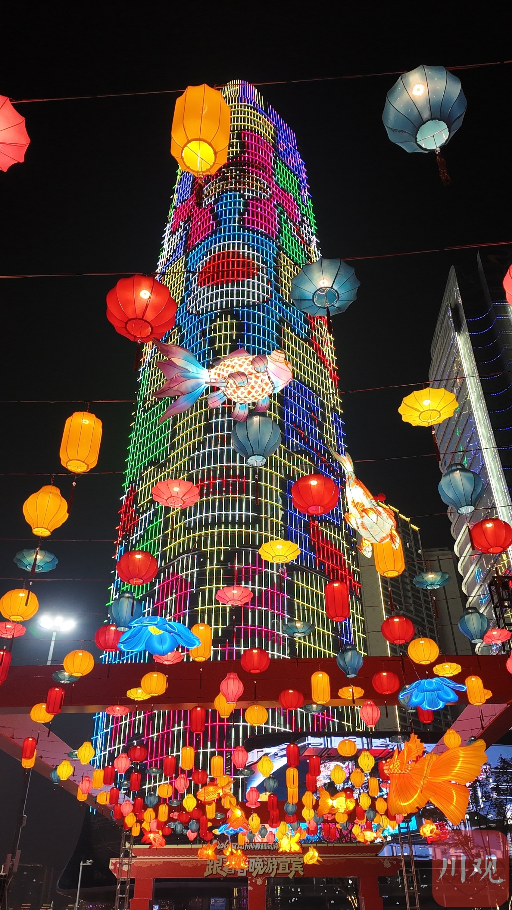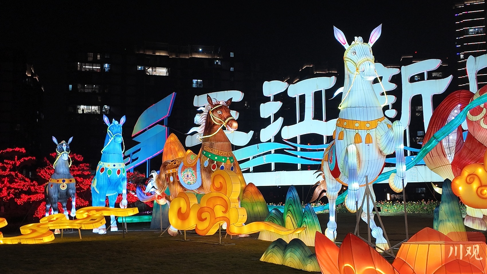叙州区东楼、市政广场、长江公园一带,红灯笼高挂、流光溢彩,熊猫、骏马、哪吒等特色灯组错落有致,市民漫步其间,笑语盈盈。三江新区长江大桥“万马奔腾”灯组现代绚丽,与江面波光相映成趣。