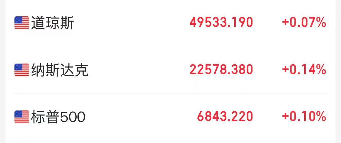 截至收盘,道琼斯指数涨0.07%,报49533.19点;标普500指数涨0.1%,报6843.22点;纳斯达克综合指数涨0.14%,报22578.38点。