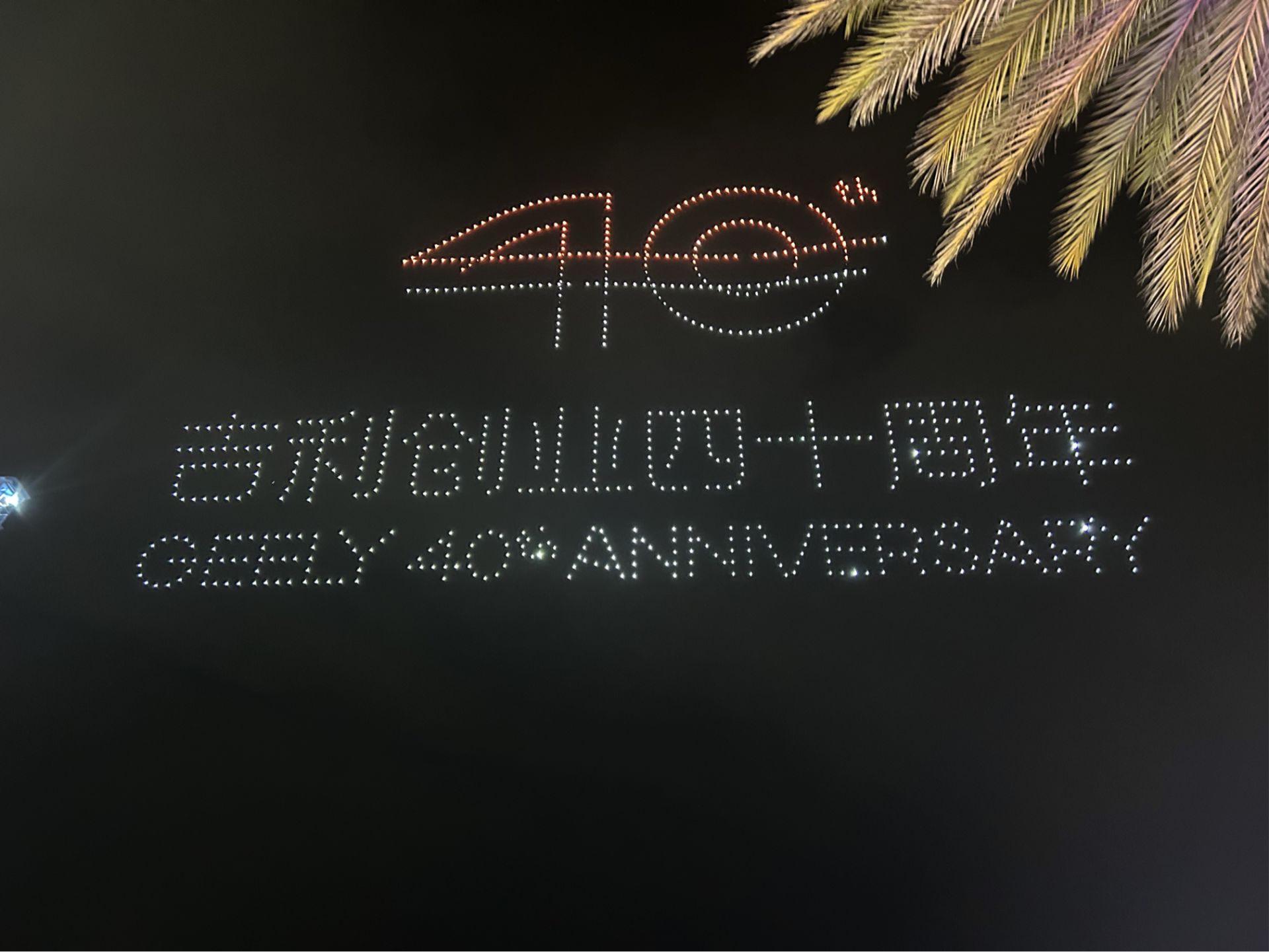 在变幻莫测的光影阵列中,细心的观众会捕捉到吉利传递的专属讯号——当无人机编队在夜空中缓缓绘出“40th 吉利创业四十周年”的波浪形Logo,紧接着变幻为“快乐人生,吉利相伴”的温暖寄语,科技不再是冰冷的参数堆叠,而变成了一种情感的连接。这一幕,既是对吉利创业四十载风雨兼程的致敬,也是对未来美好生活的期许。