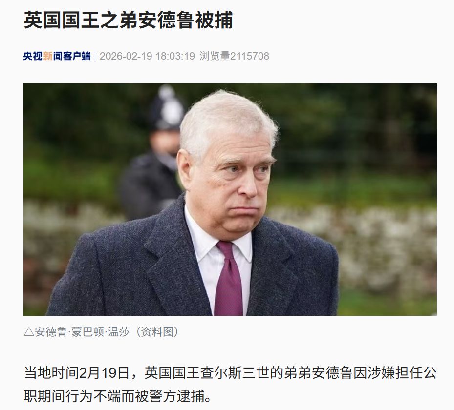 据央视新闻,当地时间2月19日,英国国王查尔斯三世的弟弟安德鲁因涉嫌担任公职期间行为不端而被警方逮捕。