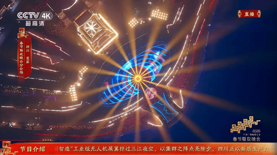 除夕夜,总台2026年春节联欢晚会宜宾分会场精彩亮相,伴着《立上游》的悠扬歌声,“四川智造”工业级无人机“翼龙”展翼掠过三江夜空,以集群之阵点亮除夕,四川正以新质生产力之笔书写崭新篇章。