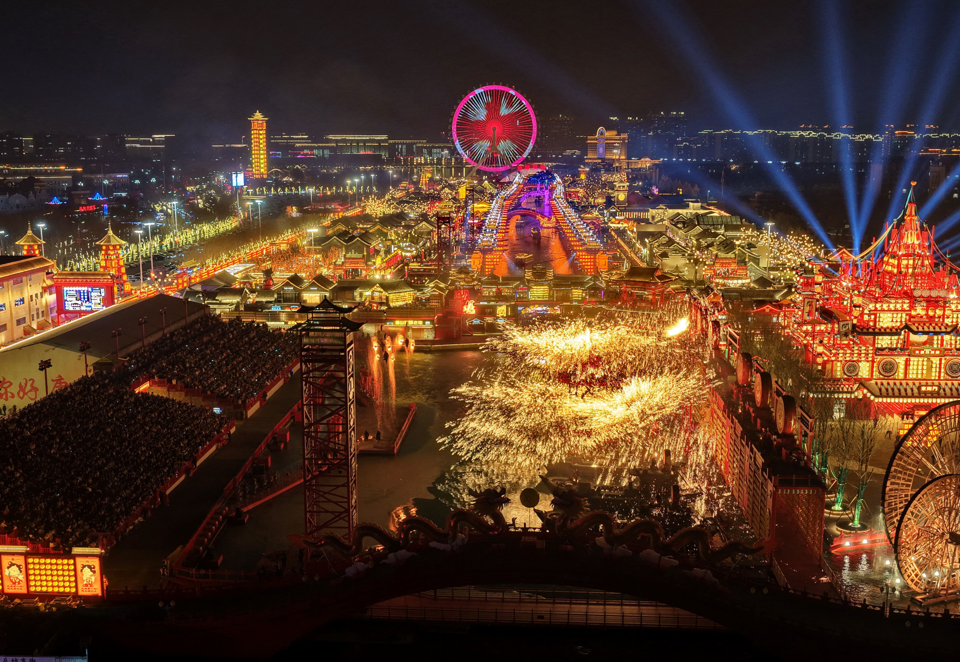 2月20日,民间艺人在河北省唐山市丰南区河头老街为游客表演“打树花” 图片来源:新华社记者 杨世尧 摄