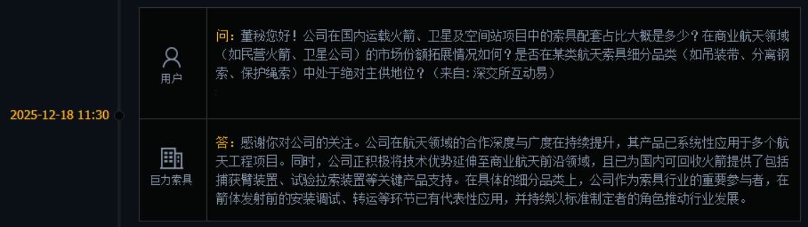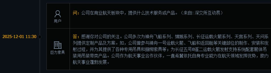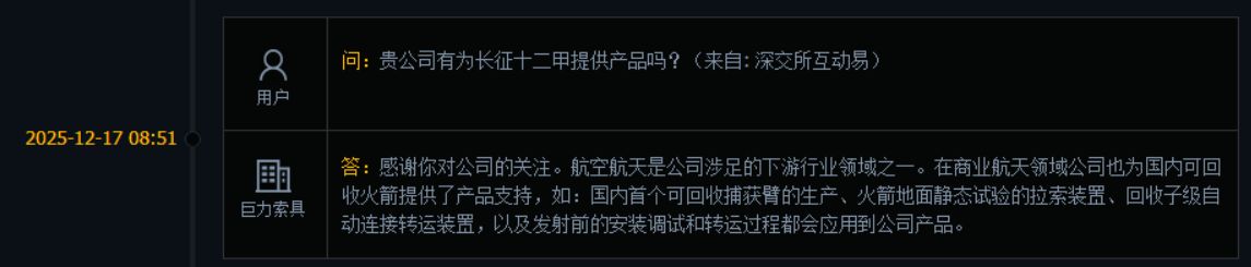 如在2025年12月18日的机构调研中,巨力索具提到“公司为商业航天地面发射提供了系统性保障,从生产组装到发射前的安装调试和转运过程都会应用到公司产品。如:全箭的起吊转运、各级间段的起吊翻转转运、星罩组合体的翻转转运、卫星的翻转转运,火箭回收转运、火箭地面静态试验的拉索装置、回收子级自动连接转运装置以及回收捕获臂装置等。”