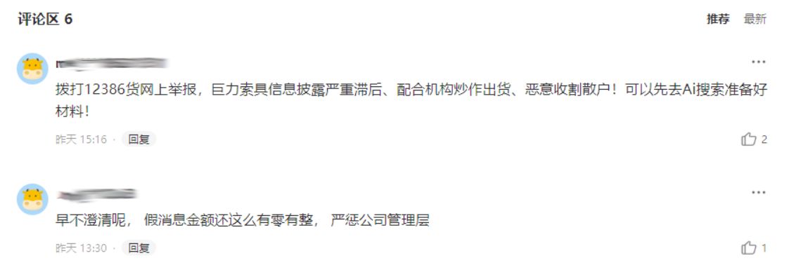 近日,巨力索具在发布澄清公告、股价连续跌停后,有投资者在股吧等平台表达不满,要求索赔和举报。甚至有投资者称“公司存在澄清严重滞后、信息披露不及时、配合资金收割散户的重大嫌疑,涉嫌违反信息披露相关规定。”也有投资者表示要举报。