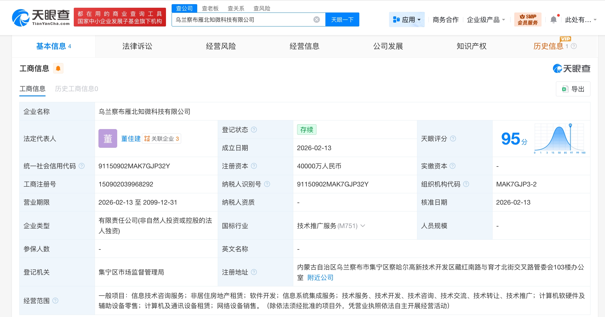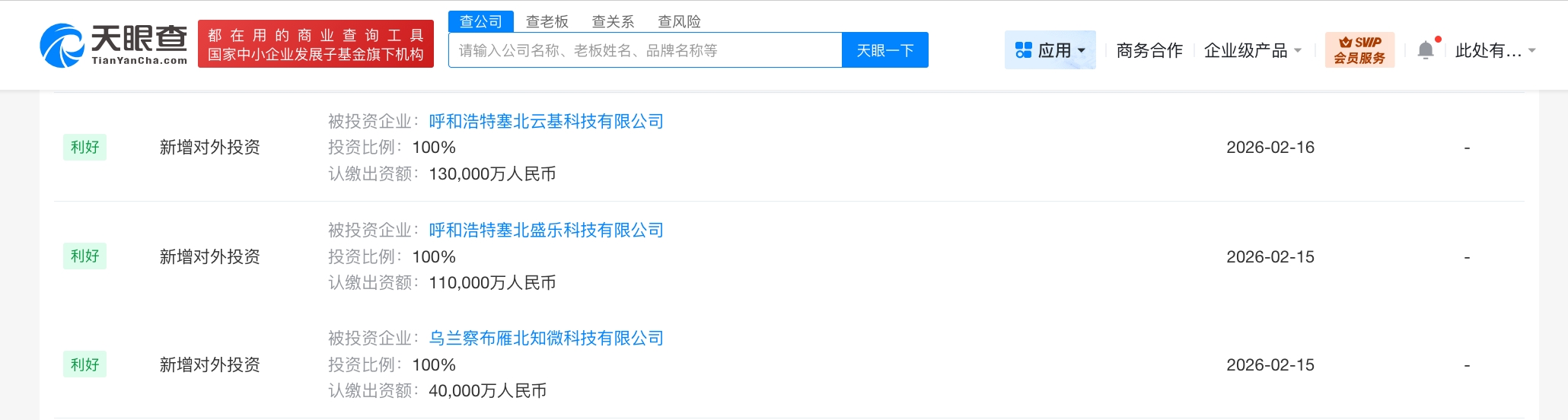 每经AI快讯,天眼查App显示,近日,呼和浩特塞北云基科技有限公司、呼和浩特塞北盛乐科技有限公司、乌兰察布雁北知微科技有限公司成立,法定代表人均为董佳建,注册资本分别为13亿元人民币、11亿元人民币和4亿元人民币,经营范围均包含信息技术咨询服务、非居住房地产租赁、软件开发、信息系统集成服务、计算机软硬件及辅助设备零售等。股东信息显示,上述3公司均有北京字跳网络技术有限公司全资持股。