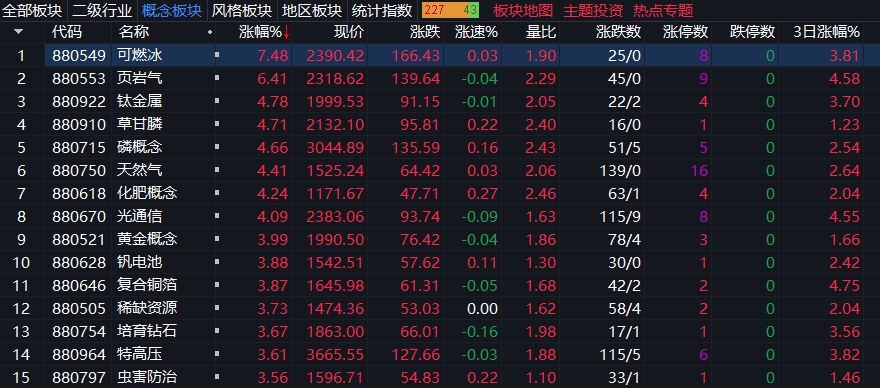 盘面上,采掘行业掀涨停潮,新锦动力、通源石油20CM涨停,中油工程、中曼石油等多股10CM涨停;贵金属、玻璃玻纤、钛白粉、CPO概念、被动元件、能源金属、电网设备等板块大涨,软件开发、游戏、保险等板块表现疲软。