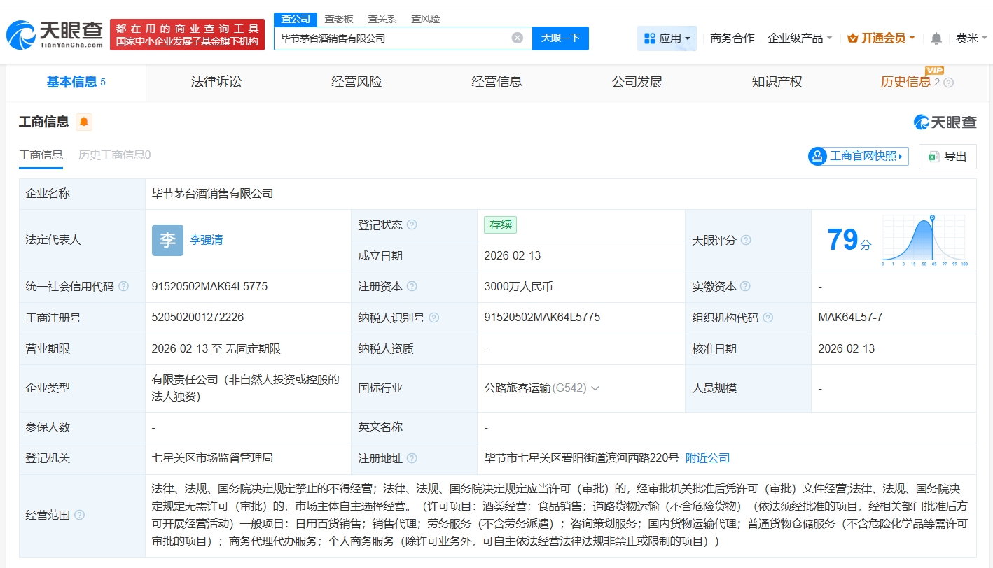 每经AI快讯,天眼查App显示,近日,毕节茅台酒销售有限公司成立,法定代表人为李强清,注册资本3000万元人民币,经营范围包括酒类经营、食品销售、道路货物运输等,由贵州茅台(600519)旗下贵州茅台酒销售有限公司全资持股。