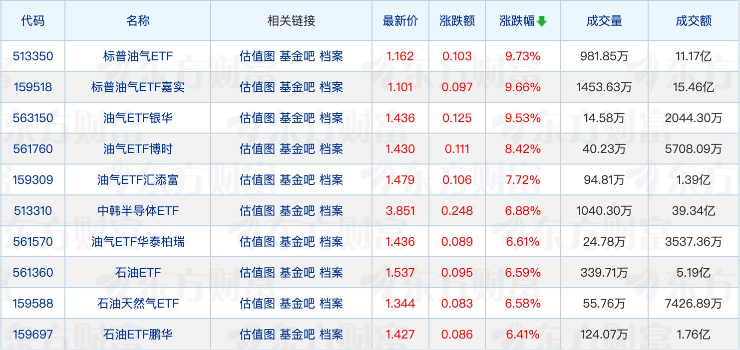 具体来看,油气股集体上涨,通源石油、准油股份等多股涨停,标普油气ETF嘉实、标普油气ETF、油气ETF银华涨超9%,多只石油相关ETF走强。