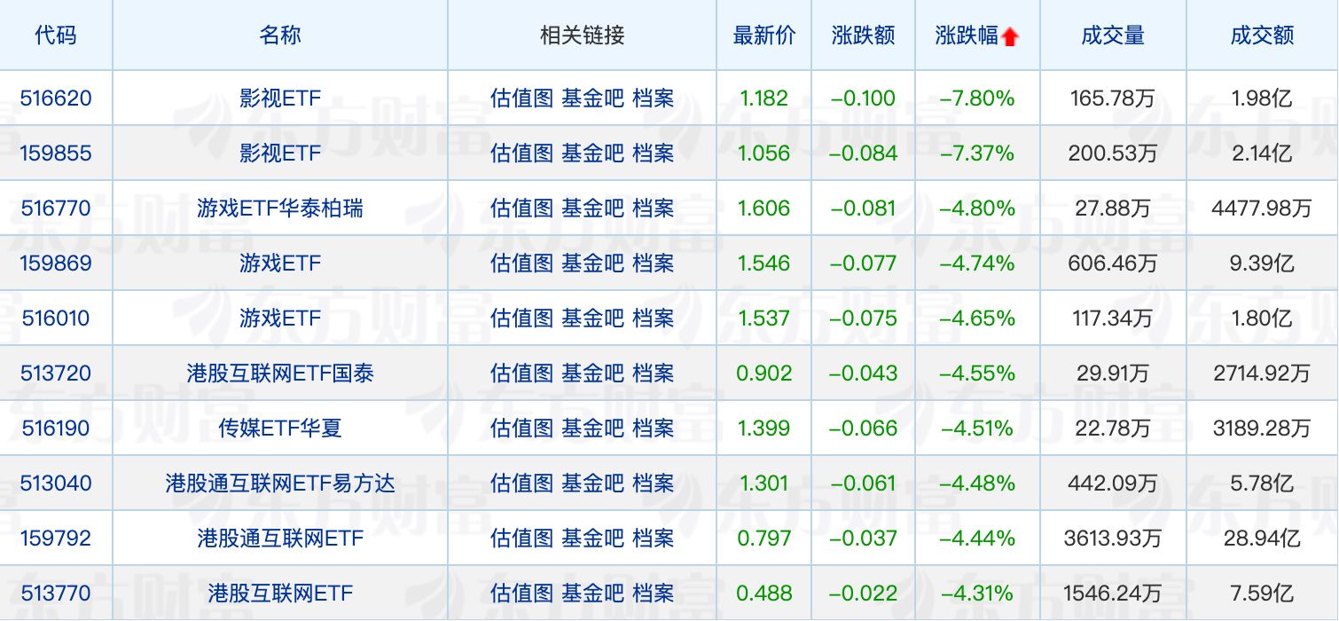 下跌方面,两只影视ETF跌幅均超过7%。