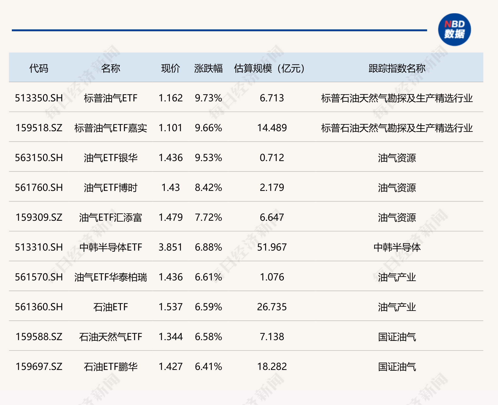 ETF涨跌幅方面,多只油气相关ETF涨超9%。