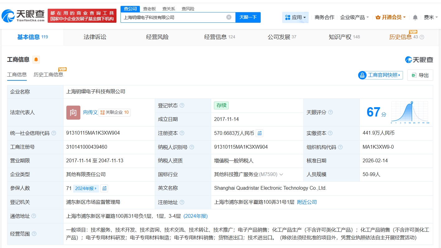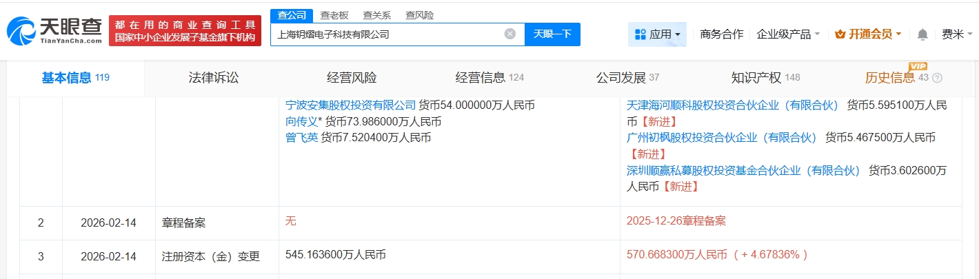 每经AI快讯,天眼查App显示,近日,上海钥熠电子科技有限公司发生工商变更,新增小米旗下瀚星创业投资有限公司、天津海河顺科股权投资合伙企业(有限合伙)等为股东,同时注册资本由约545.2万元人民币增至约570.7万元人民币。该公司成立于2017年11月,法定代表人为向传义,经营范围包括电子专用材料研发、电子专用材料制造、电子专用材料销售等,现由向传义、上海道迩企业管理中心(有限合伙)及上述新增股东等共同持股。公开资料显示,该公司是一家专注于OLED材料研发和生产的创新型高科技企业。