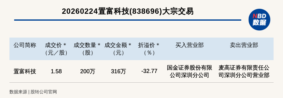 每经讯,2026年2月24日,新三板创新层公司置富科技(838696,收盘价:2.35元)发生一笔大宗交易,成交价1.58元/股,成交数量200万股,成交金额316万元,折价32.77%。买入营业部是国金证券股份有限公司深圳分公司,卖出营业部是麦高证券有限责任公司深圳分公司营业部。