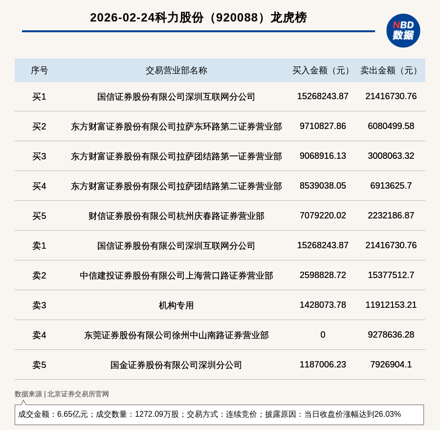 每经讯,2026年2月24日,北交所上市公司科力股份(920088,收盘价:54.61元)登上龙虎榜,交易方式是连续竞价,披露原因是当日收盘价涨幅达到26.03%,成交数量1272.09万股,成交金额6.65亿元。买一席位为国信证券股份有限公司深圳互联网分公司,买入1526.82万元;卖一席位为国信证券股份有限公司深圳互联网分公司,卖出2141.67万元。
