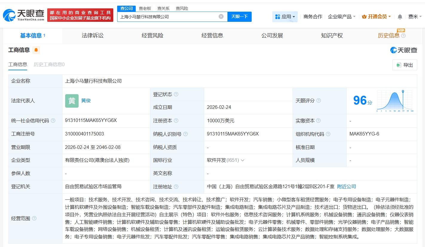 每经AI快讯,天眼查App显示,2月24日,上海小马慧行科技有限公司成立,法定代表人为黄俊,注册资本1亿美元,经营范围包括软件开发、汽车销售、小微型客车租赁经营服务等,由香港小马智行有限公司全资持股。