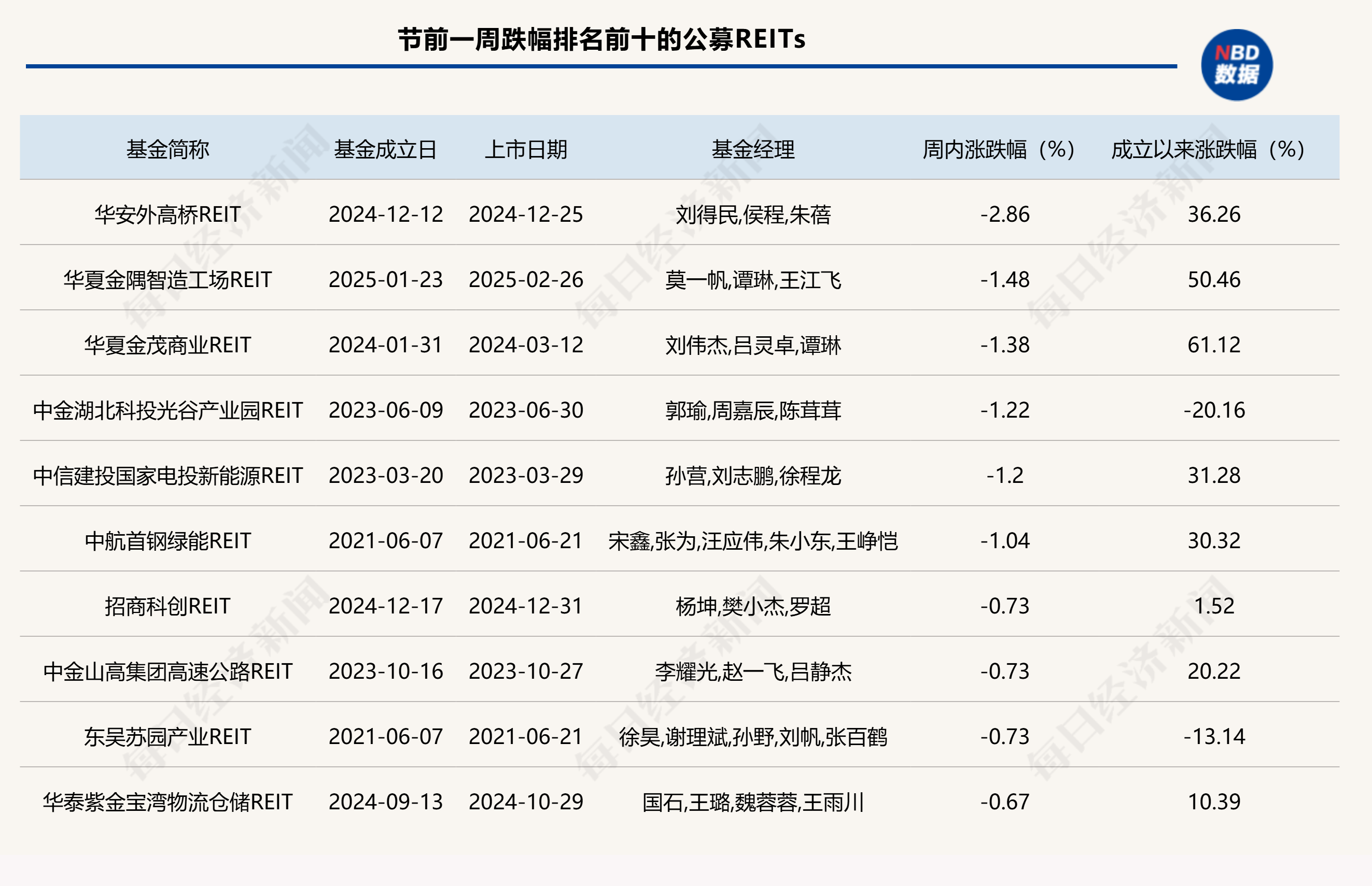 环比下跌的则减少至19只,跌幅最大的三只产品是华安外高桥REIT、华夏金隅智造工场REIT和华夏金茂商业REIT,周内分别下跌了2.86%、1.48%和1.38%。