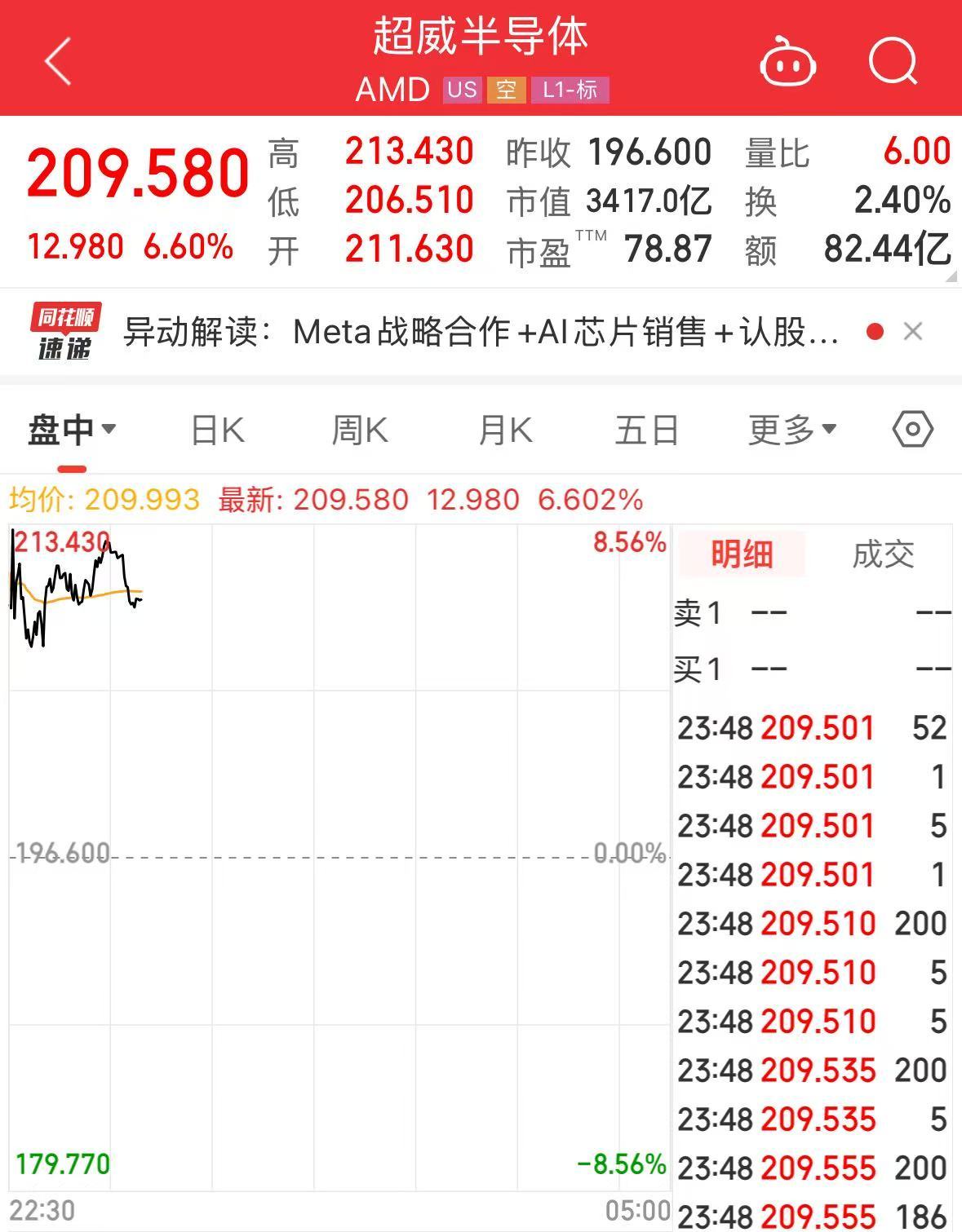 另值得注意的是,AMD一度大涨超8%,截至发稿,涨6.6%,市值3417亿美元。
