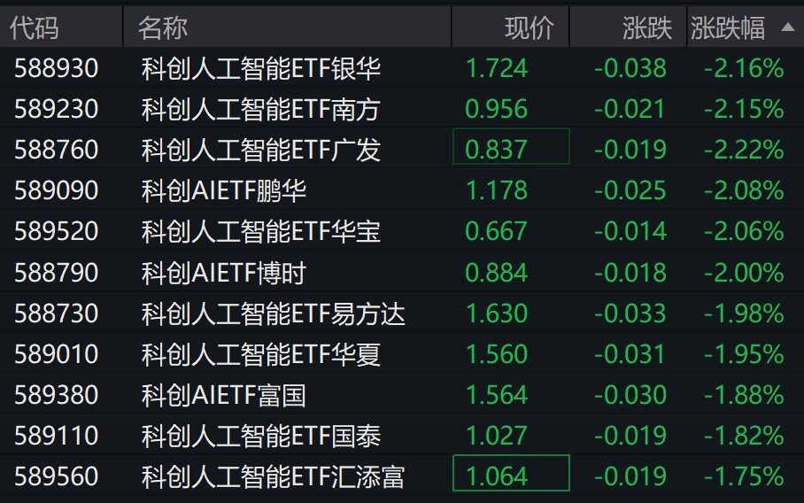 受盘面影响,科创人工智能相关ETF跌约2%。