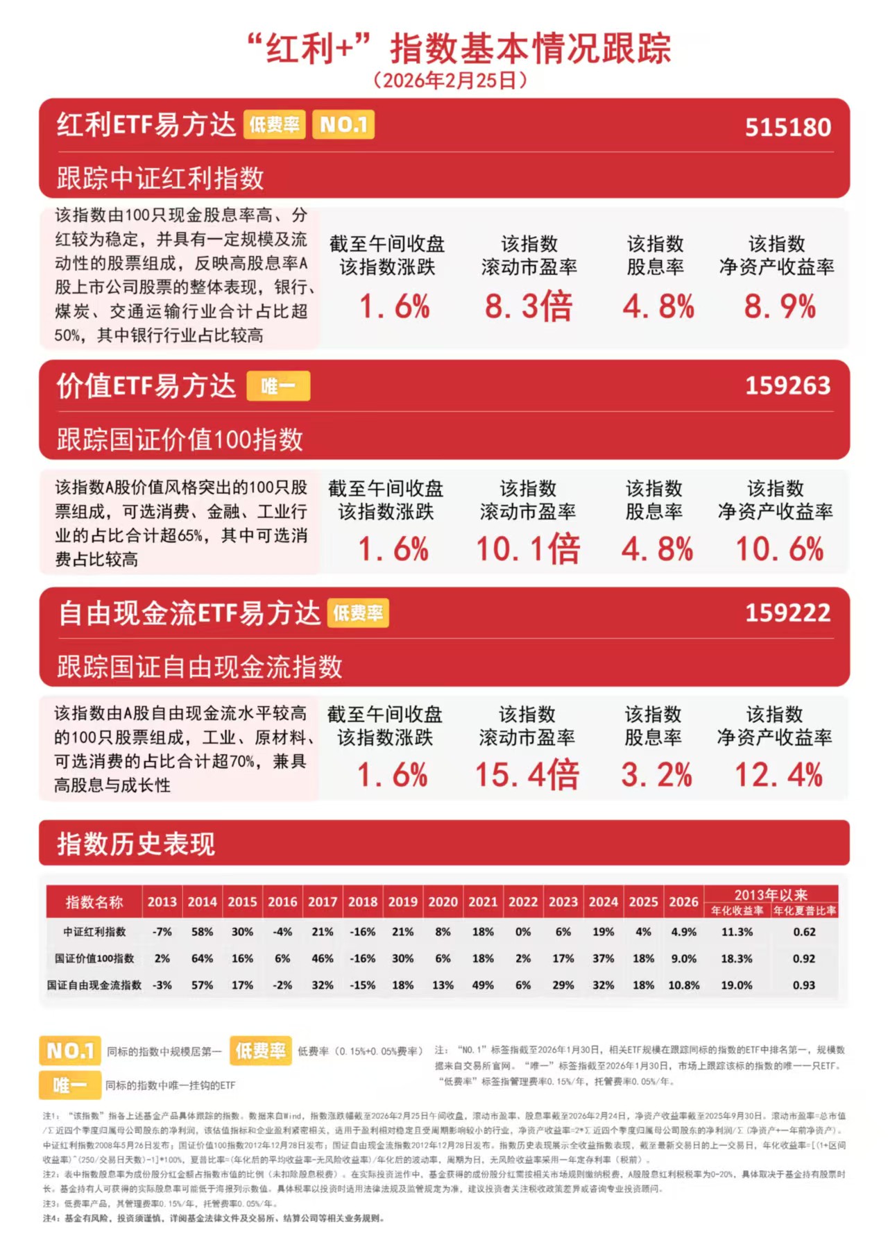 国证价值100指数采用“高分红+高自由现金流+低市盈率”三维筛选体系,优选价值标的,历史表现稳健;国证自由现金流指数则采用自由现金流率进行选样,兼具高股息与成长性。价值ETF易方达(159263)和自由现金流ETF易方达(159222)分别跟踪以上指数,可助力投资者把握相关风格投资机遇。