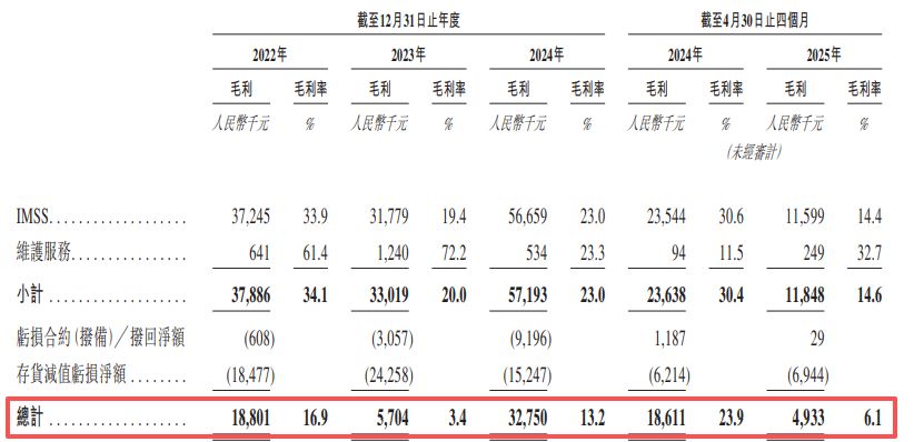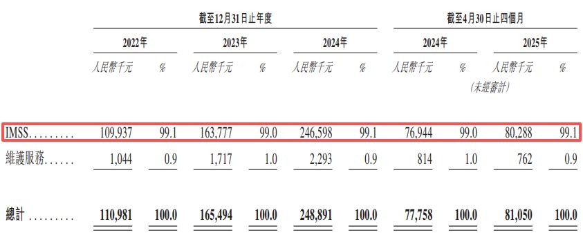 据招股书,2022年、2023年、2024年和2025年前四个月(下称“报告期内”),哥瑞利的主要收入来自于智能制造软件解决方案(IMSS),收入占比分别为99.1%、99%、99.1%和99.1%,剩下极小部分的收入则来自于维护服务。