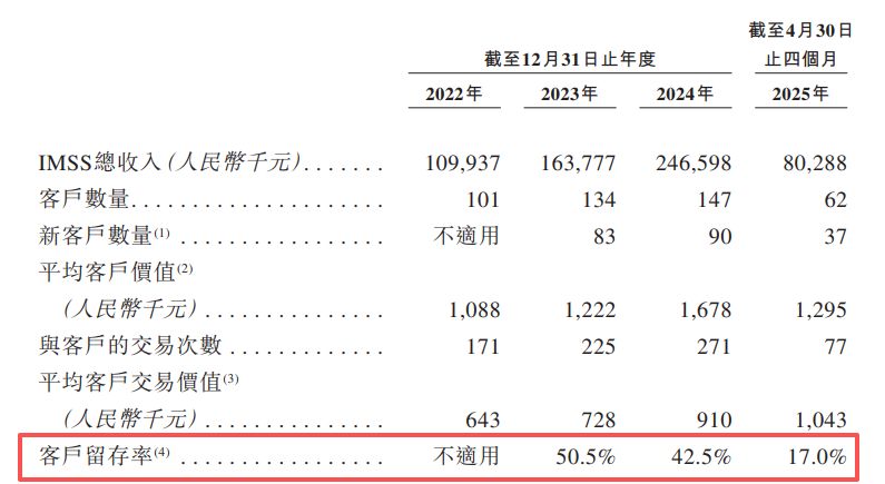 然而,在哥瑞利最核心的IMSS业务上,客户留存率指标在报告期内呈现持续下降趋势——2023年的客户留存率为50.5%,2024年降至42.5%,截至2025年前四个月,该指标进一步下滑至17%,累计下滑33.5个百分点。