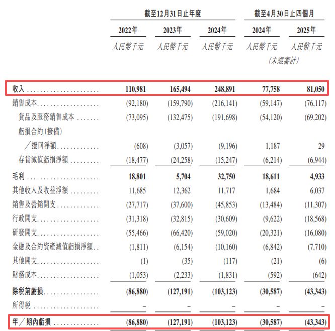 乘着行业的东风,哥瑞利的营收表现颇为亮眼。报告期内,公司分别实现收入1.11亿元、1.65亿元、2.49亿元和8105万元。然而,与营收的增长形成鲜明对比的是,哥瑞利的盈利能力迟迟未能兑现。报告期内,公司的净亏损分别达8688万元、1.27亿元、1.03亿元和4334万元,累计亏损超过3.6亿元。