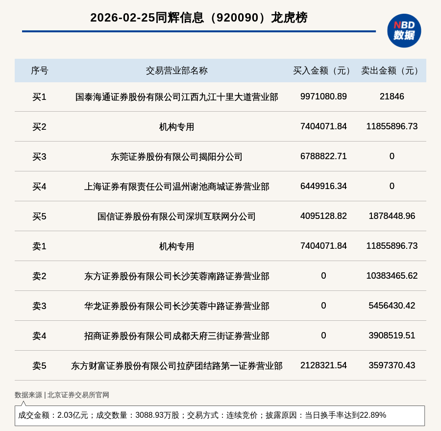 每经讯,2026年2月25日,北交所上市公司同辉信息(920090,收盘价:6.33元)登上龙虎榜,交易方式是连续竞价,披露原因是当日换手率达到22.89%,成交数量3088.93万股,成交金额2.03亿元。买一席位为国泰海通证券股份有限公司江西九江十里大道营业部,买入997.11万元;卖一席位为机构专用,卖出1185.59万元。