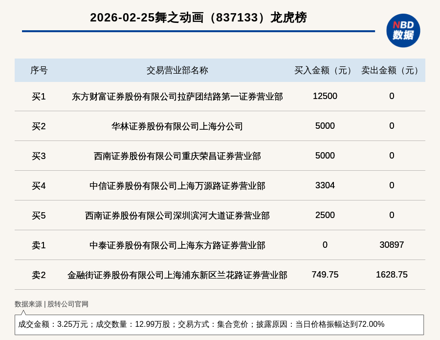 每经讯,2026年2月25日,新三板基础层公司舞之动画(837133,收盘价:0.25元)登上龙虎榜,交易方式是集合竞价,披露原因是当日价格振幅达到72.00%,成交数量12.99万股,成交金额3.25万元。买一席位为东方财富证券股份有限公司拉萨团结路第一证券营业部,买入1.25万元;卖一席位为中泰证券股份有限公司上海东方路证券营业部,卖出3.09万元。