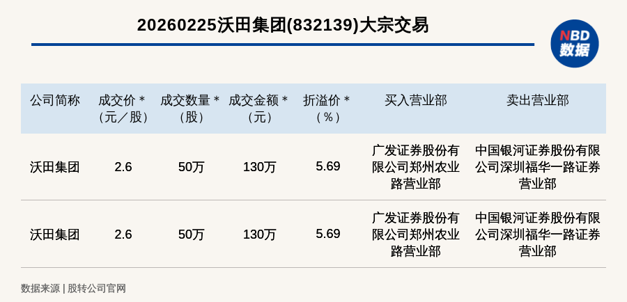 每经讯,2026年2月25日,新三板创新层公司沃田集团(832139,收盘价:2.46元)发生2笔大宗交易,总成交金额为260万元,成交金额最高的一笔成交价2.6元/股,成交数量50万股,成交金额130万元,溢价5.69%。买入营业部是广发证券股份有限公司郑州农业路营业部,卖出营业部是中国银河证券股份有限公司深圳福华一路证券营业部。