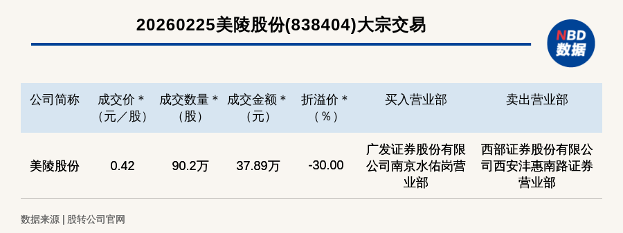 每经讯,2026年2月25日,新三板基础层公司美陵股份(838404,收盘价:0.6元)发生一笔大宗交易,成交价0.42元/股,成交数量90.2万股,成交金额37.89万元,折价30%。买入营业部是广发证券股份有限公司南京水佑岗营业部,卖出营业部是西部证券股份有限公司西安沣惠南路证券营业部。