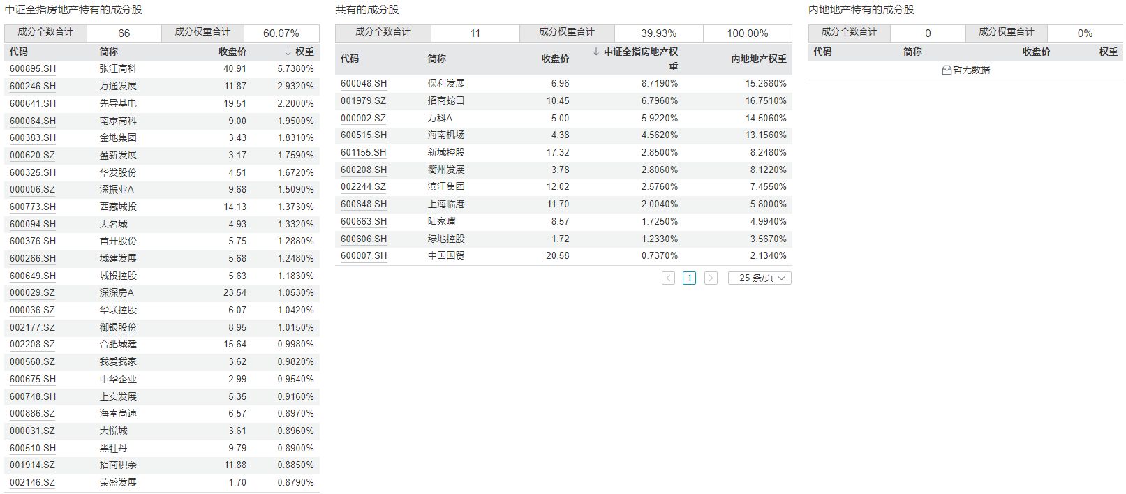 此外,中证全指房地产指数还有66只独有的成分股,主要包括了张江高科、万通发展、先导基电等。