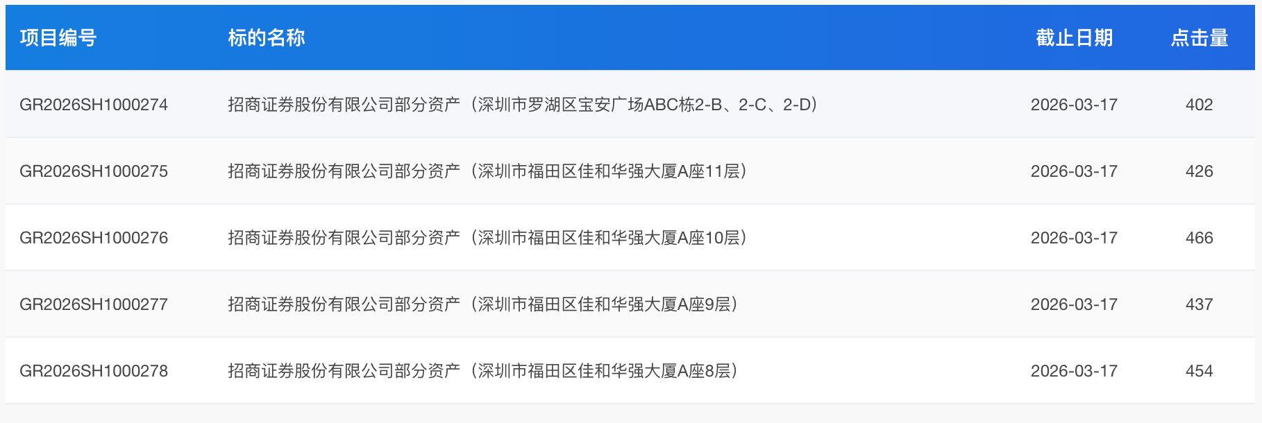 根据上海联合产权交易所官网披露,招商证券正在出售旗下5处房产,合计出售价格约为1.48亿元,挂牌时间为2026年2月11日至2026年3月17日,这5处房产均位于深圳市。