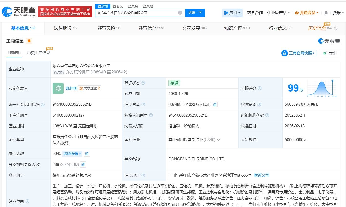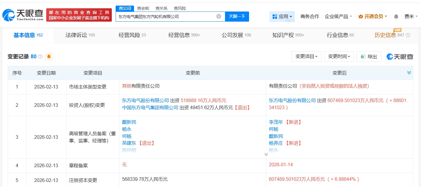 每经AI快讯,天眼查App显示,近日,东方电气集团东方汽轮机有限公司发生工商变更,原股东中国东方电气集团有限公司退出,同时,注册资本由约56.8亿元人民币增至约60.7亿元人民币,增幅约7%。该公司成立于1989年10月,法定代表人为陈仲明,经营范围包括风力发电机组、太阳能及可再生能源、工业控制与自动化等,由东方电气股份有限公司全资持股。