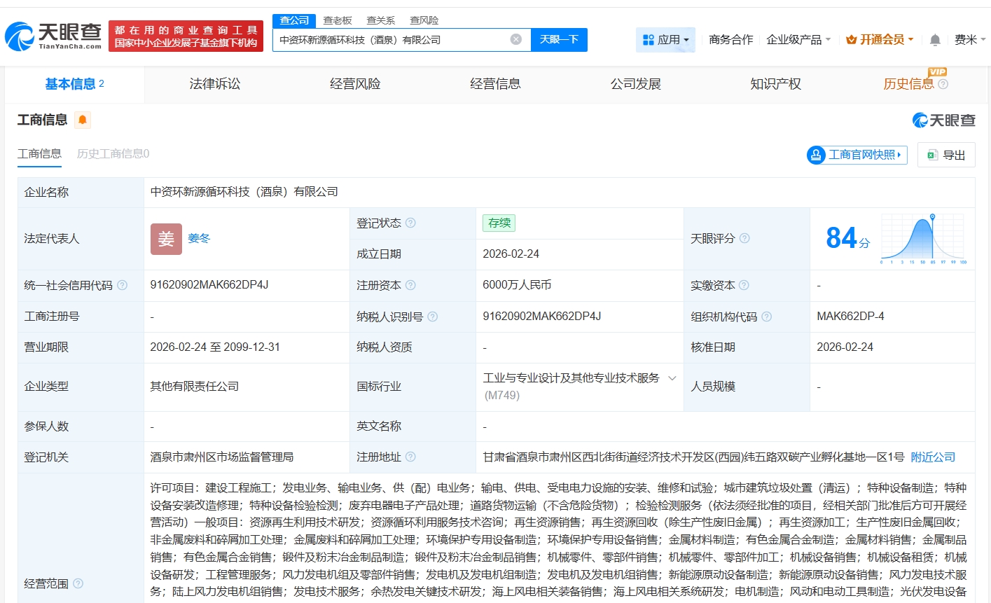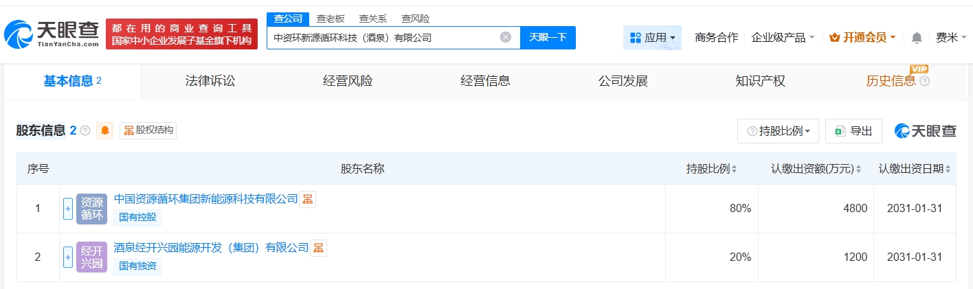 每经AI快讯,天眼查App显示,近日,中资环新源循环科技(酒泉)有限公司成立,法定代表人为姜冬,注册资本6000万元人民币,经营范围包括建设工程施工、特种设备制造、特种设备安装改造修理等,由中国资源循环集团新能源科技有限公司、酒泉经开兴园能源开发(集团)有限公司共同持股。