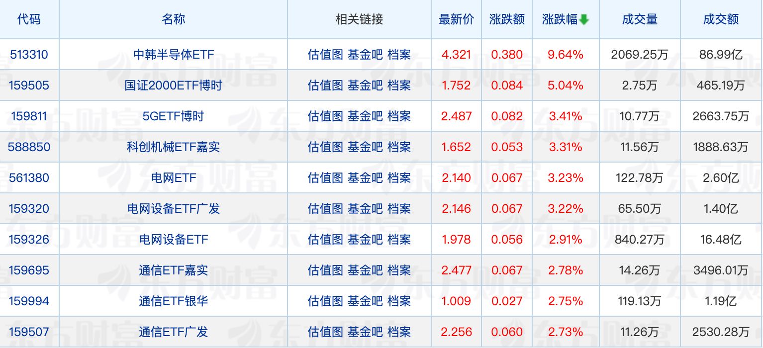 具体来看,中韩半导体ETF领涨9.64%,国证2000ETF博时涨超5%,电网设备相关ETF走强。